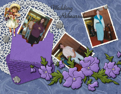 These two layouts have some of the photo's from my Wedding Rehearsal. My Brides Maids in the first one, and my Dad walking me down the isle in the filmstrip of the 2nd one...we have big grins on our face, unfortunately I don't remember what was going on, to make us smile that big. The last picture in the filmstrip is my DH and I, and don't ask me what I was doing, but I look kinda funny so I had to include it! LOL